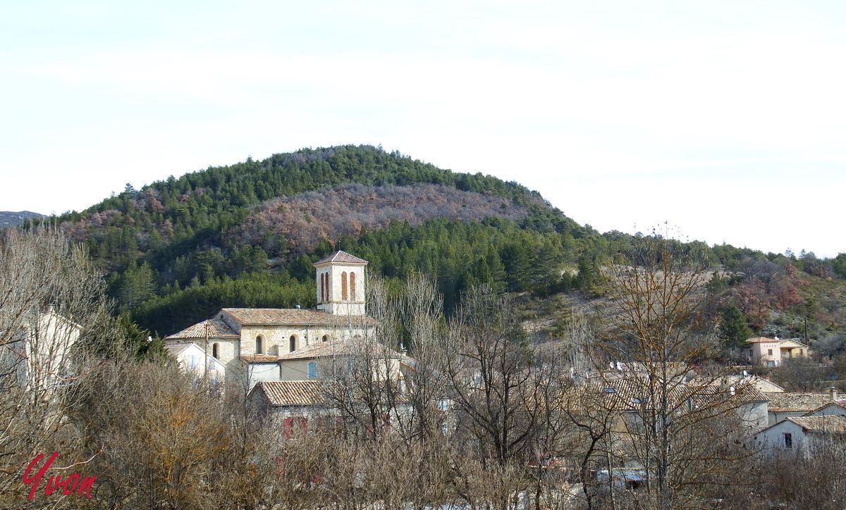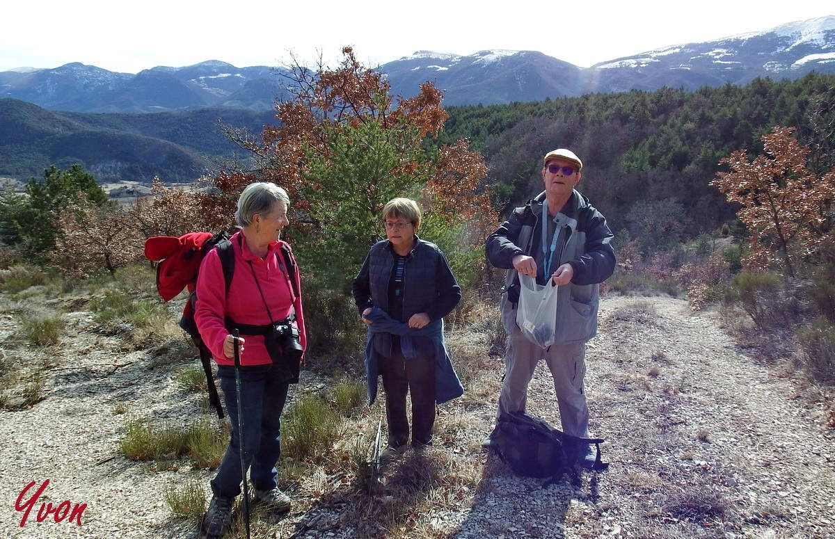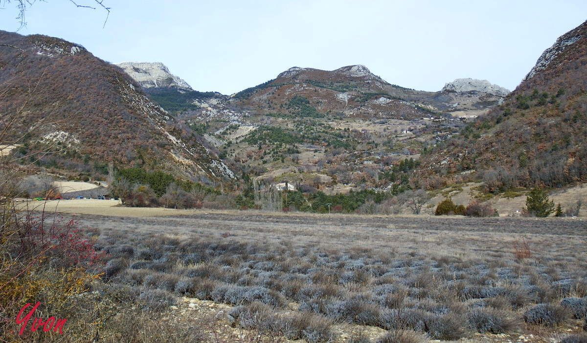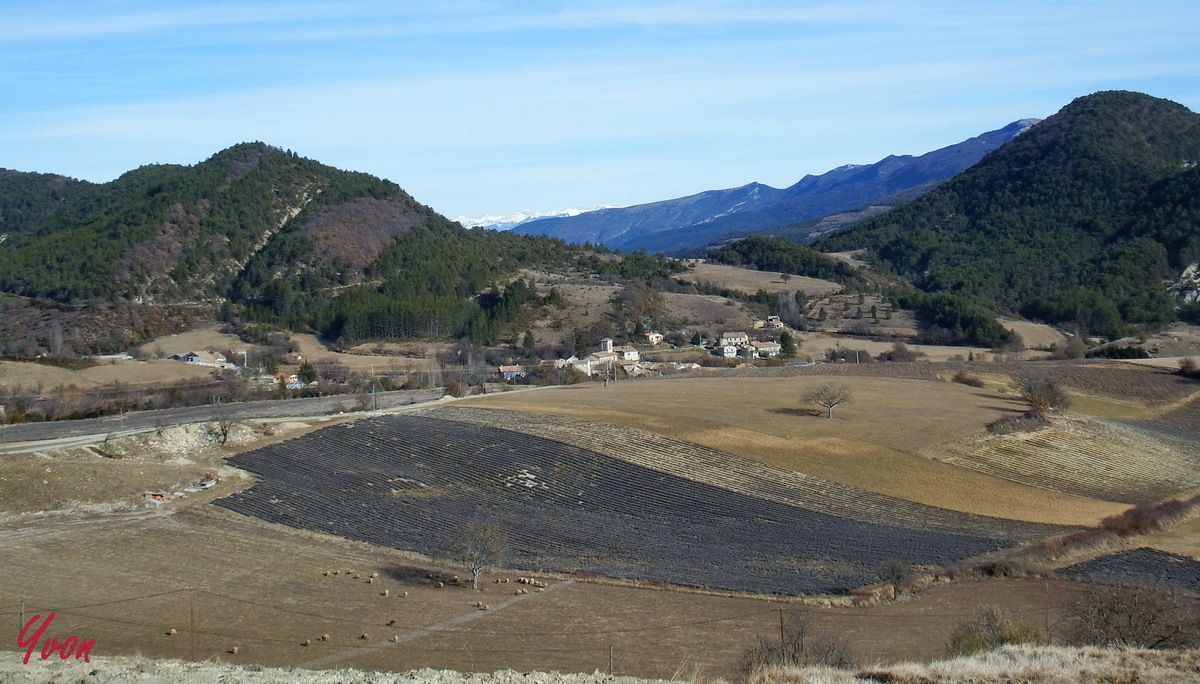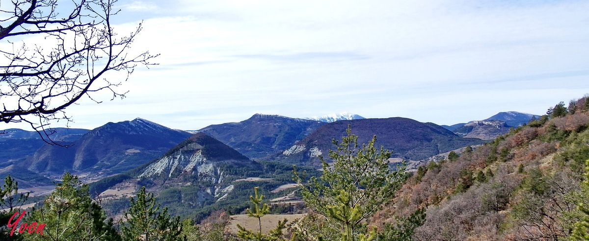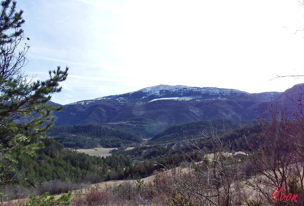 Les sommets sont encore un peu enneigés. On reconnait les sommets de Bergies, et du Buc, et au loin le Ventoux...