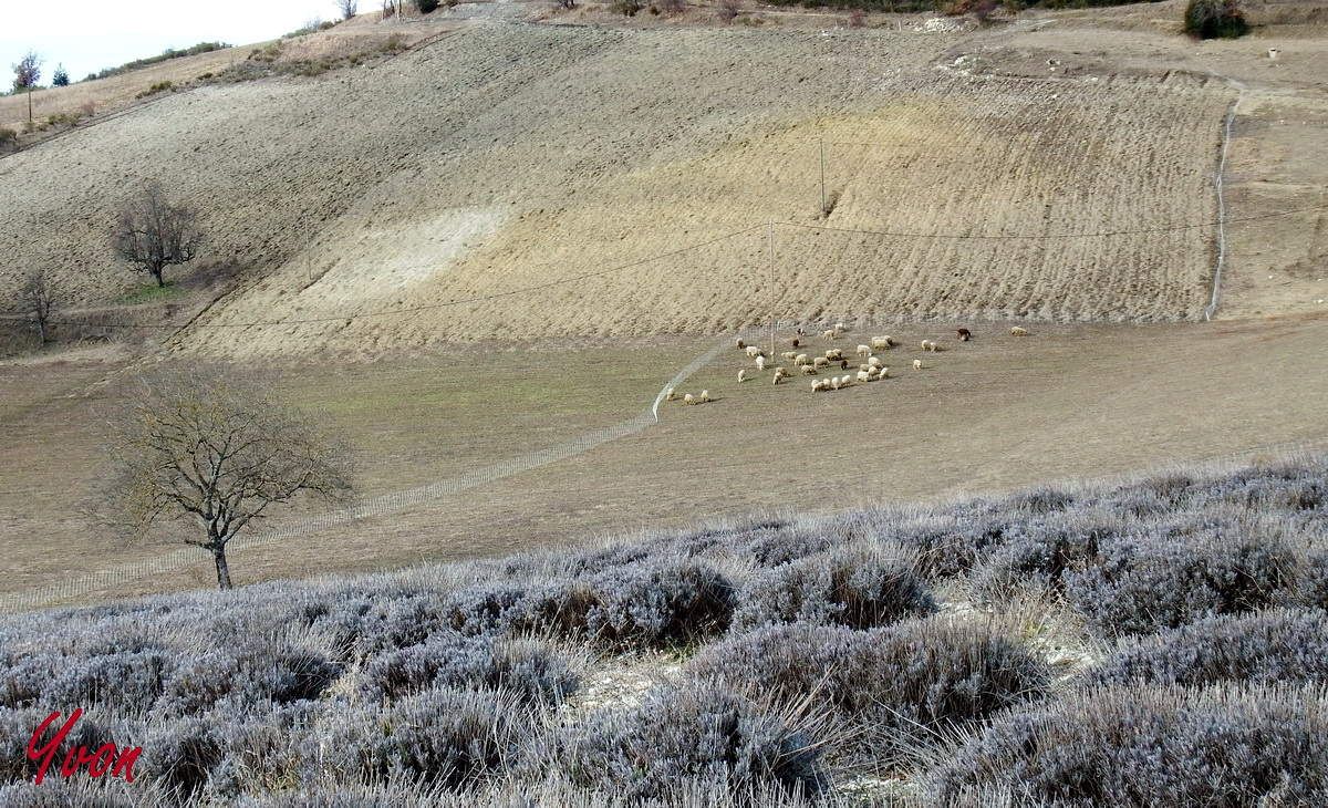 Une belle image qui résume bien notre "Haute Provence" . La lavande, les amandiers, et le troupeau qui est de sortie. Les moutons profitent de l'herbe nouvelle.